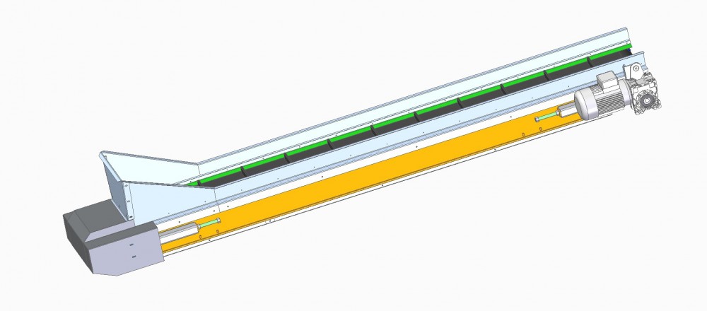 Der glatte Trogförderer gehört zu den leichten glatten Fördereinrichtungen, deren Breite sich im Bereich von 300 - 2 000 m bewegen kann. Der Förderer kann mit glatten PVC-Bändern, mit Kistenbändern oder mit Faltenbälgen ausgestattet sein. Dieser Förderer wird in der Landwirtschaft, in der holzverarbeitenden Industrie, in der Kunststoffherstellung, der Lebensmittelindustrie und der pharmazeutischen Industrie eingesetzt werden.